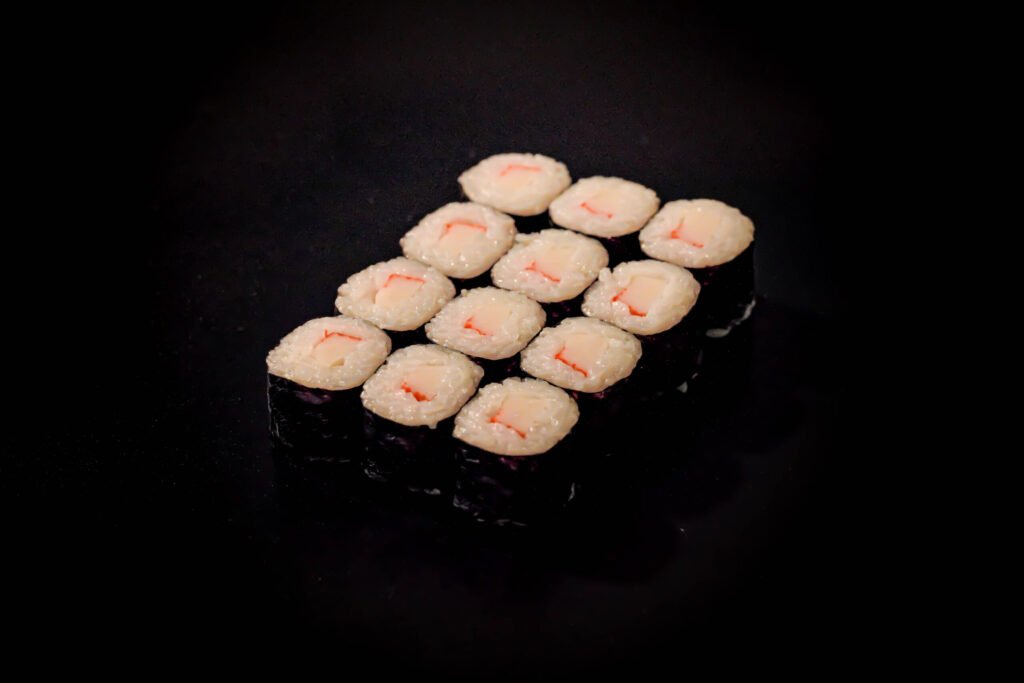 Kani Maki is a single sushi roll filled with imitation crab. The roll is compact and easy to eat, with the crab providing a mild and sweet flavor. It is a simple roll that is perfect for a quick sushi fix. The nori wrapper adds a slight crispness.
