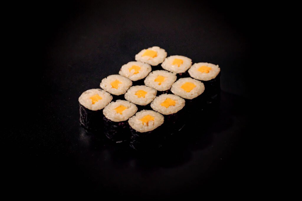 Tamago Maki are sweet egg rolls cut into twelve pieces. The egg is cooked into a sweet omelet and rolled with rice. These rolls have a gentle sweetness that is comforting. They are a popular choice for children and those new to sushi.